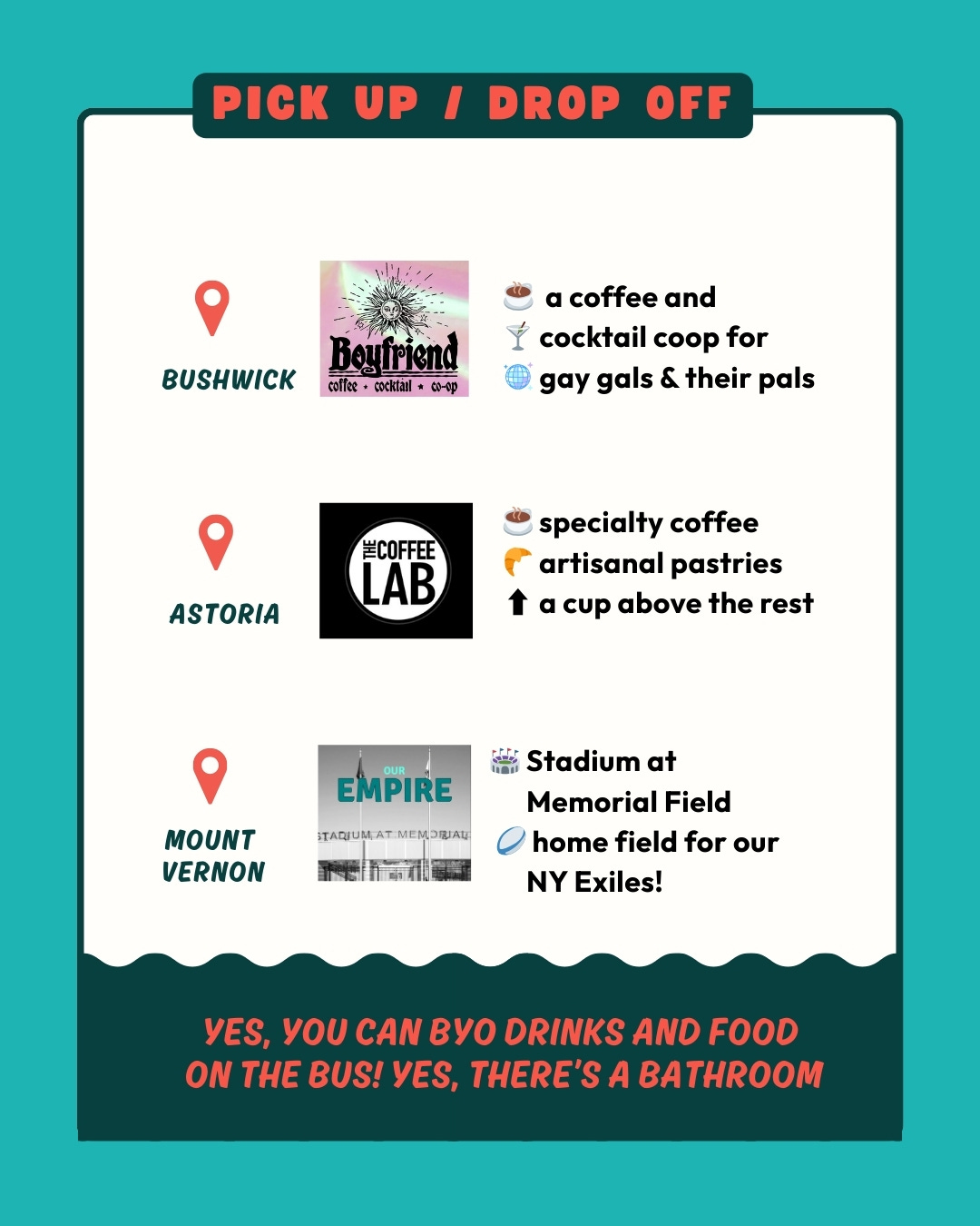 We’ve got the sweetest pick up and drop off partners. Even if you’re not joining us, add these spots to your places to visit map. Boyfriend Co-op is a new coffee & cocktail cooperative for gay gals & their pals ☕️🍸 The Coffee Lab is a cafe gem in Astoria serving up specialty coffee and artisanal pastries. 🥐