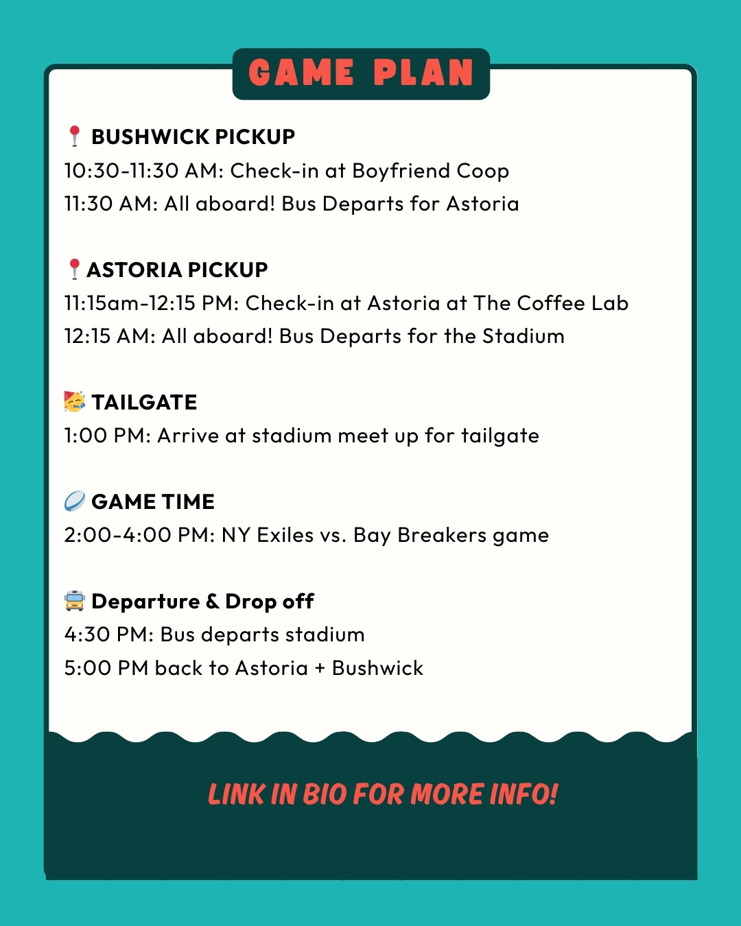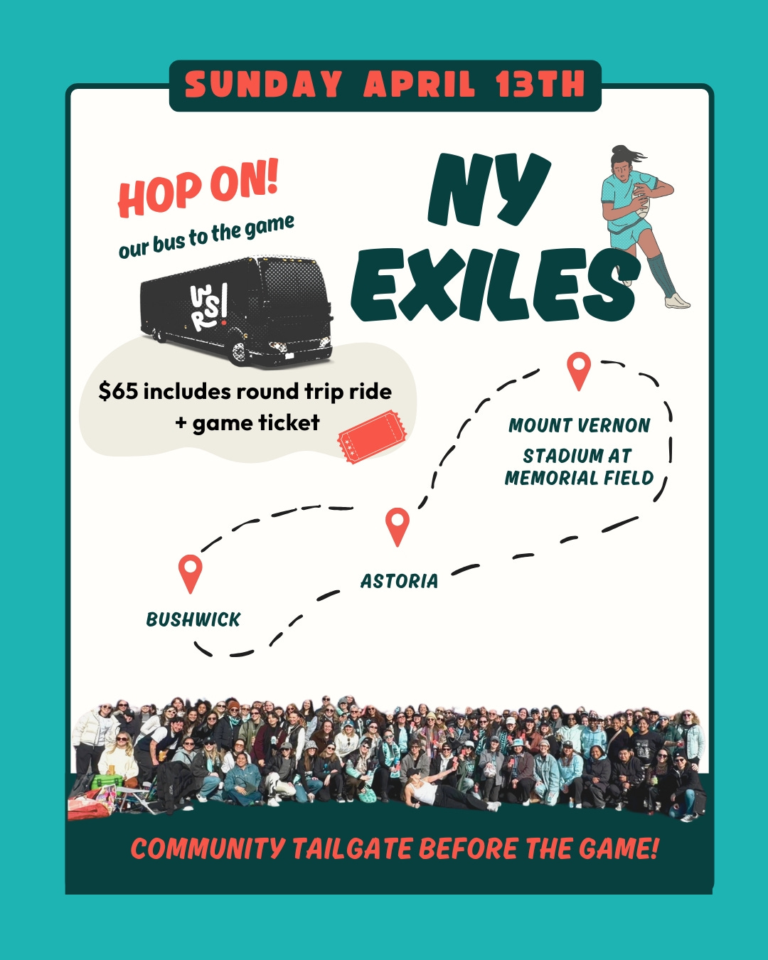 Quick note to say if you want to join us for our round trip bus + tailgate + game ticket to the NY Exiles this Sunday April 13th grab your tickets now! Sales will end at noon on Friday and we’ve got 10 spots left.